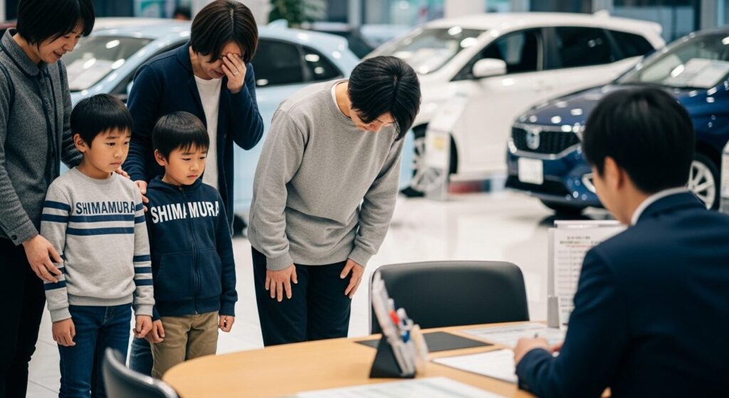 周りでは、新しい車を契約する楽しそうな家族の笑い声が響く。